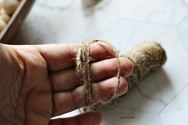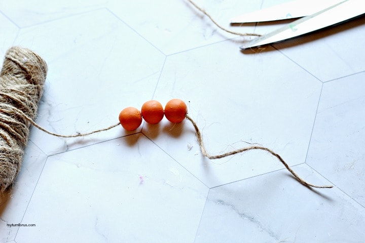 - Slide beads over the end of the twine, use 12-15 depending on the size of your napkins. Leave 3-4 inches of excess twine on either end.