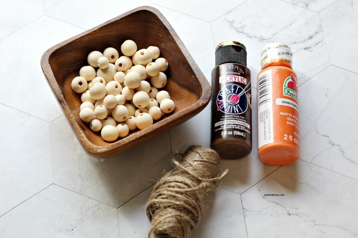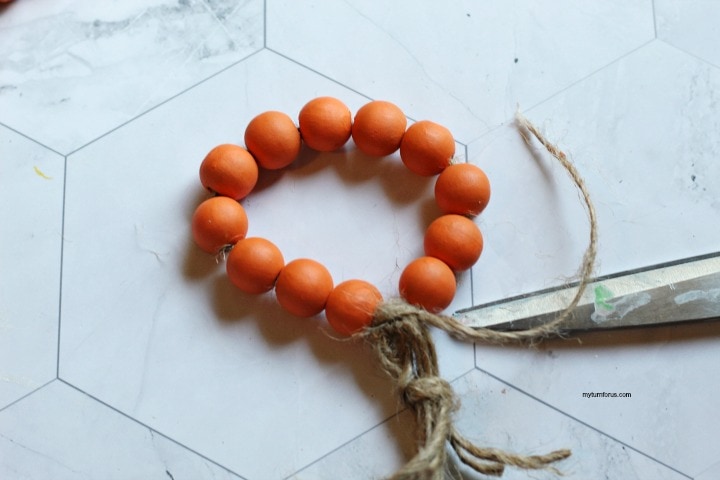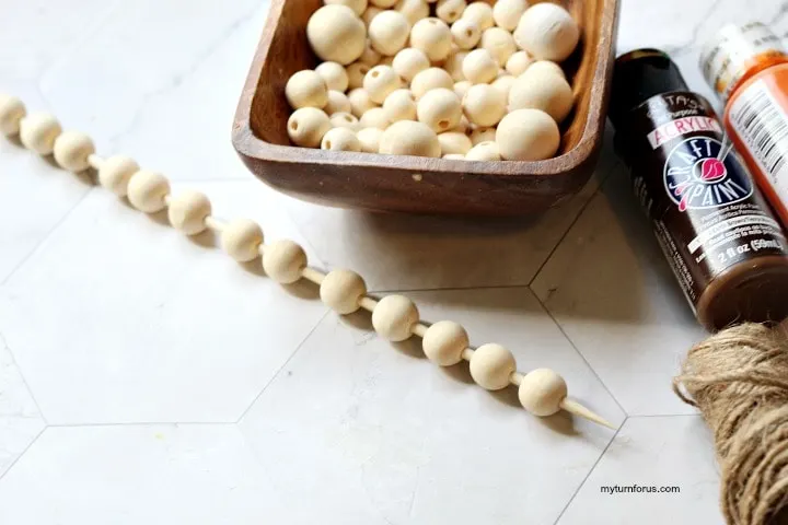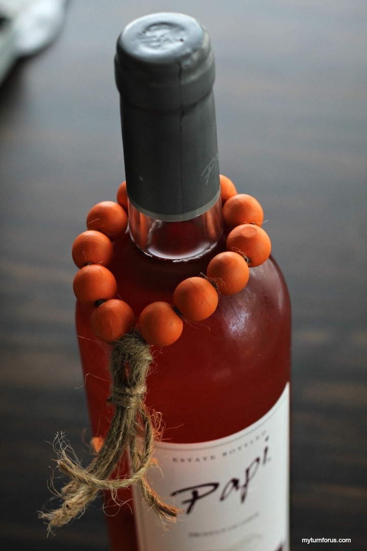 I love the simple natural look of farmhouse beads strung carelessly over a pile of books or wrapped around an old glass vase. And these would be gorgeous used as farmhouse decor, either painted or plain wood. Also, they will make a sweet little touch to a bottle of wine for your fall hostess gifts!