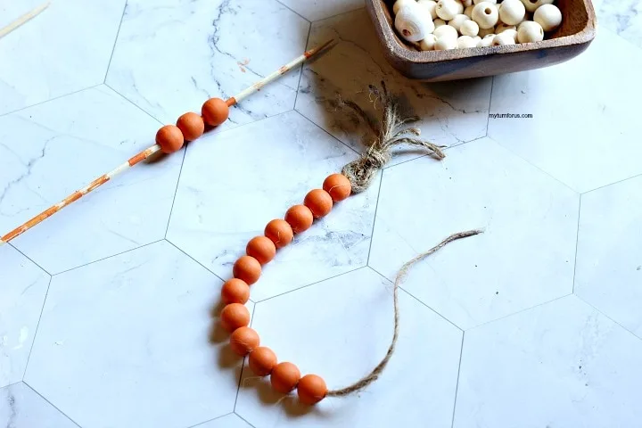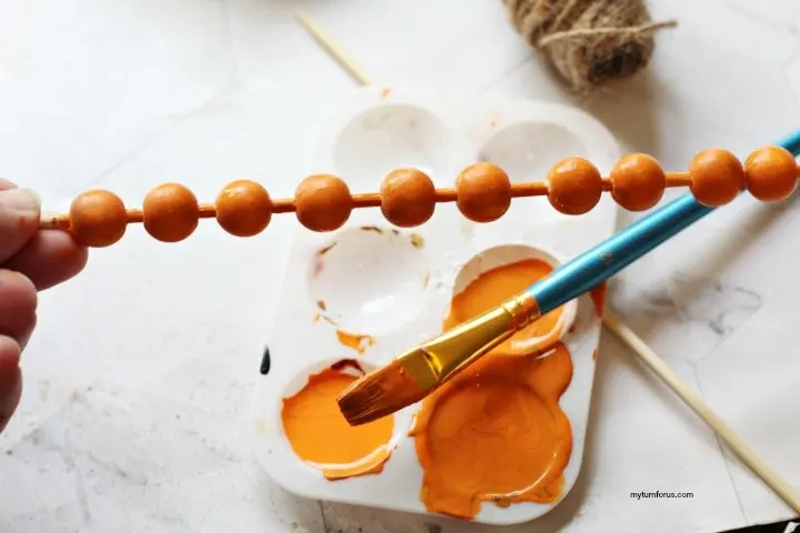 Apply one coat of orange craft paint all over the beads, be sure to cover it entirely, allow to dry until paint is no longer tacky. Once dry, add another coat to give it nice solid finish, allow to dry again.