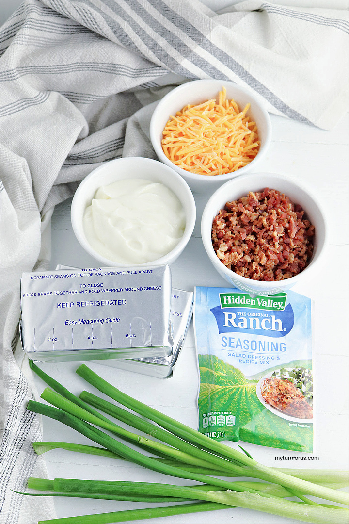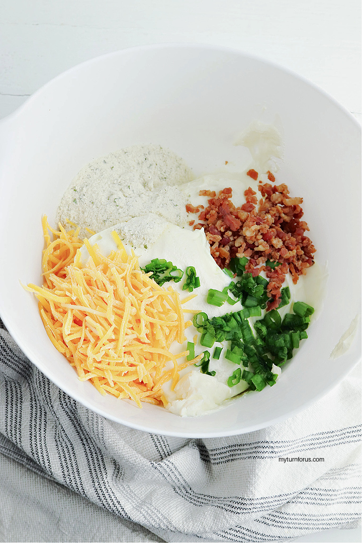 - Stir together the cream cheese, ¼ cup sour cream (save the other ¼ cup for making the laces), and ranch seasoning until well combined. Fold in the shredded cheese, green onions, and half the bacon bits.