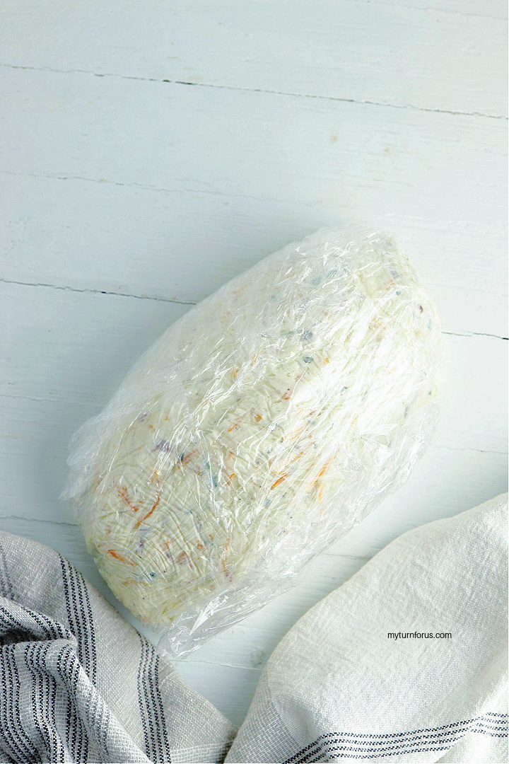 - Form the cheeseball mixture into a football shape and wrap it tightly with plastic wrap.