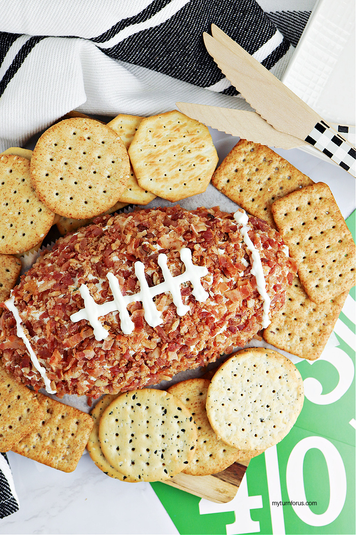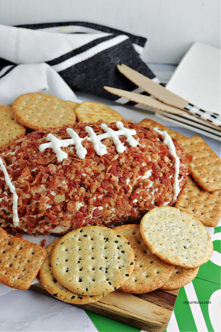 Serve with different crackers or chips! Remember, just as a unique and well-executed play can change the direction of a football game, this creative serving idea can elevate your Super Bowl party. A football-shaped cheese ball isn’t just a dish; it’s an experience that leaves a lasting impression on your guests. Enjoy the Super Bowl.