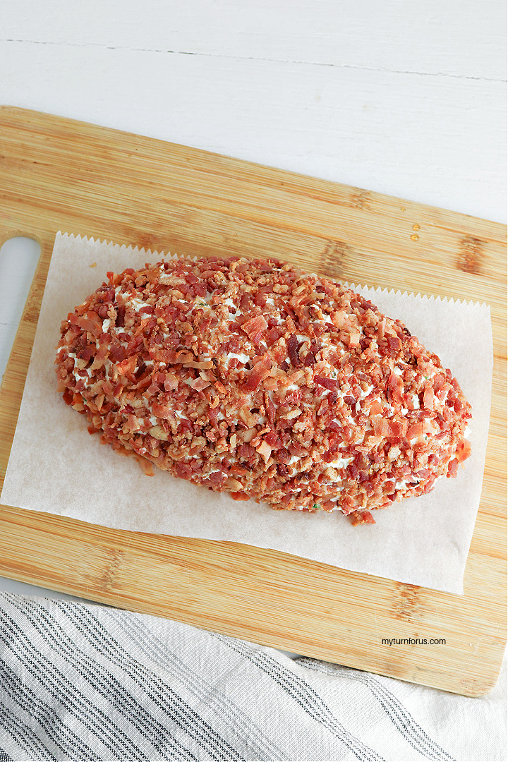 - Unwrap the cheeseball and place on parchment paper on a cutting board. Coat with all the bacon bits until fully covered using your hands to press the bacon bits into the cheese.