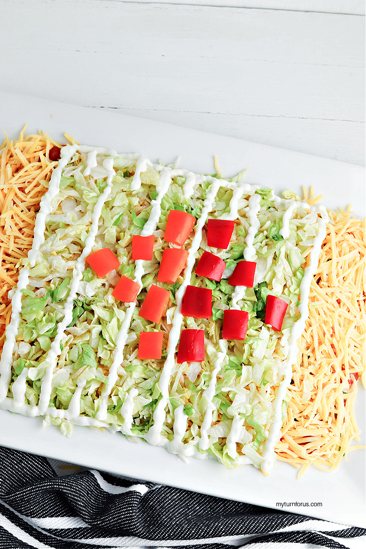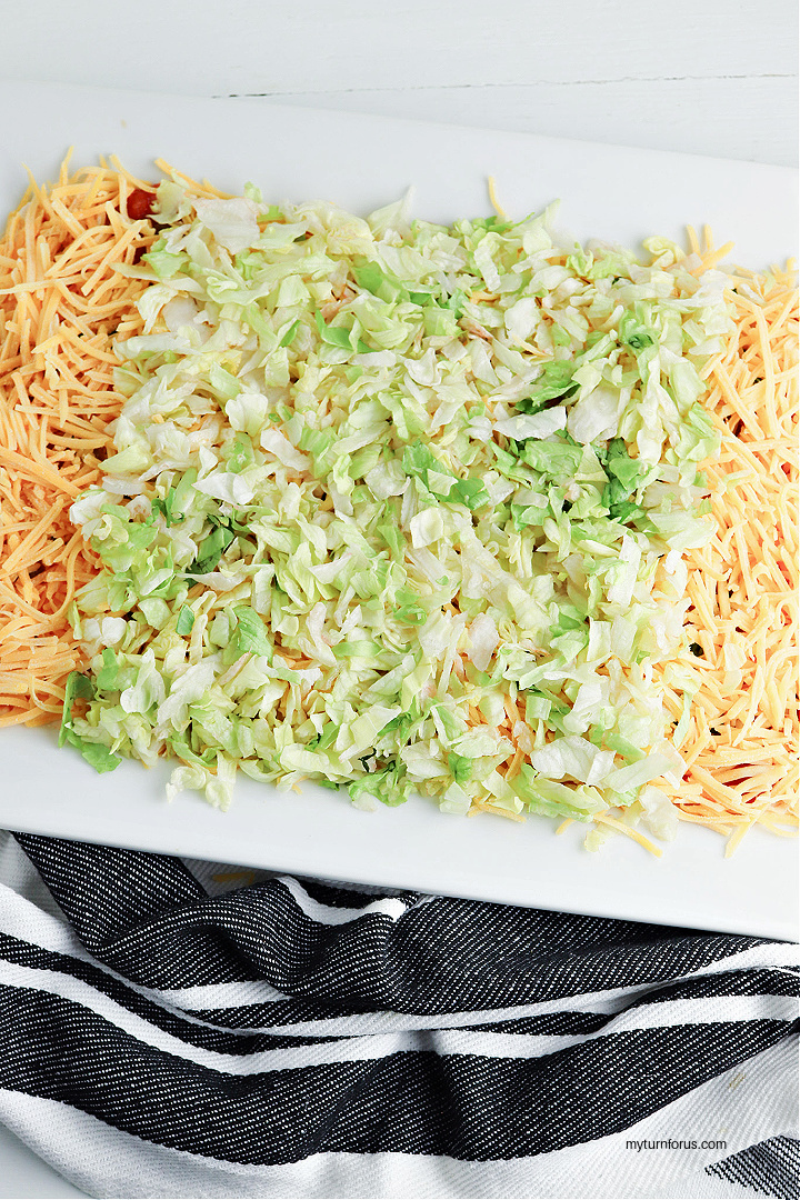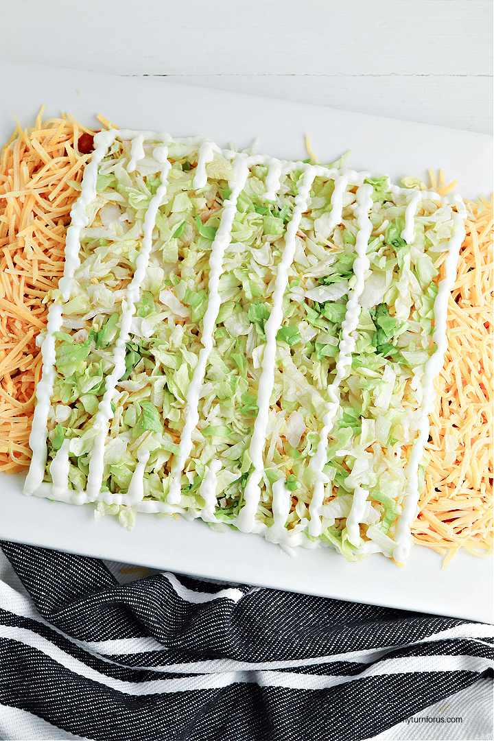 - Top the center of the cheese layer with the shredded lettuce, leaving cheese on each end of the platter to form the end zones.