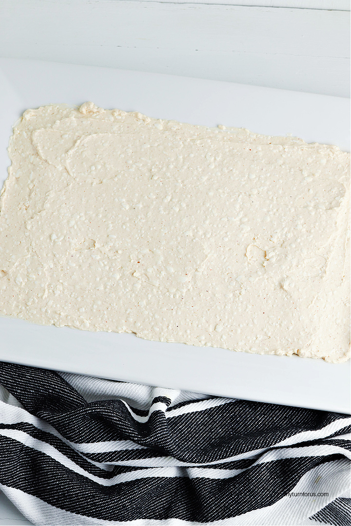 - Spread the cream cheese taco mixture evenly over the bottom of a large rectangular serving platter.