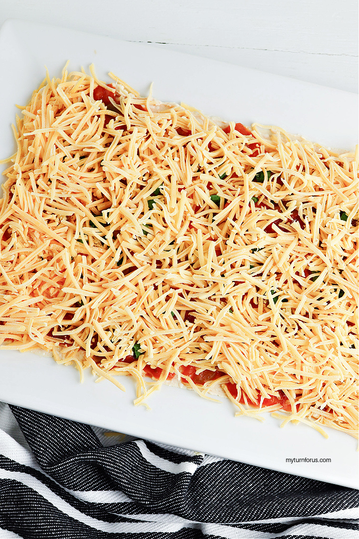 - Sprinkle all of the shredded cheese evenly over the top of the salsa.