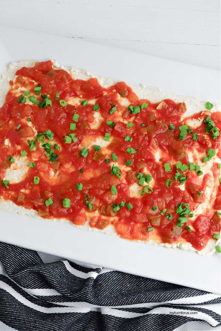 - Evenly spread a layer of the salsa over the cream cheese layer and then sprinkle on the chopped green onions.