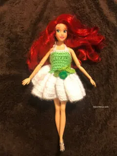 Use the white yarn, double crochet twice in every stitch to create ruffle on the bottom of the dress . Tie Off