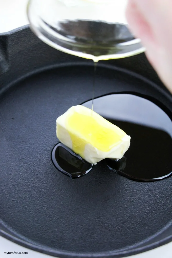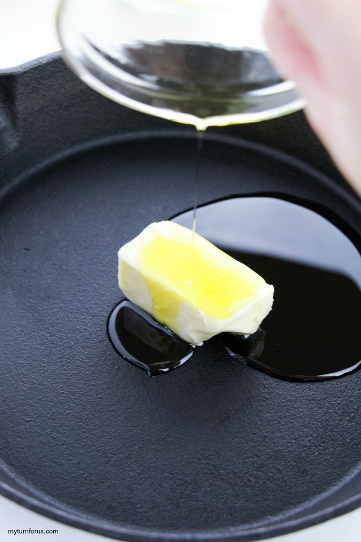 - Meanwhile melt the butter and olive oil together in a cast iron skillet over medium heat.