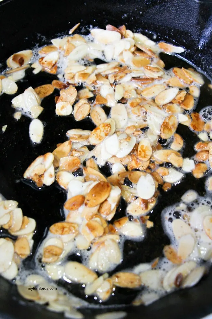 - As soon as your butter melts and is hot add the slivered almonds. Toast the almonds for 2-4 minutes, and stir occasionally. You can toast until just lightly beige or until golden brown.
