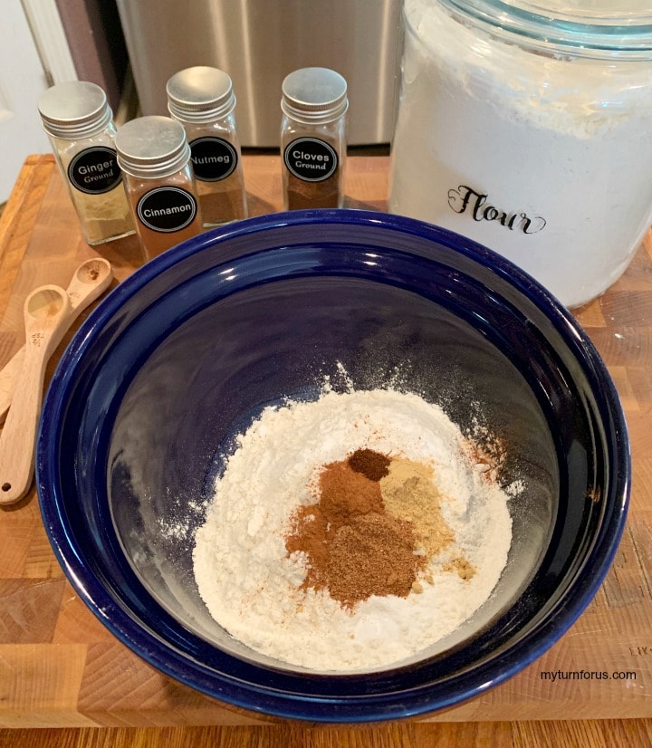 • In a separate bowl, combine flour, baking soda, cinnamon, ginger, nutmeg, cloves and salt and mix well