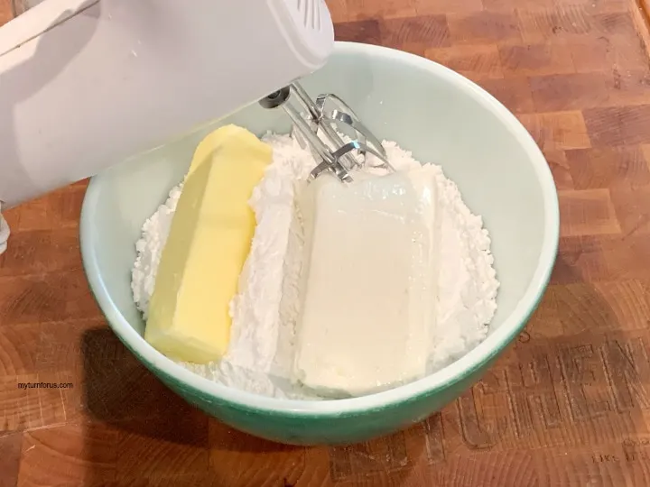 Measure out the powdered sugar into a large mixing bowl and add the butter and cream cheese.