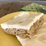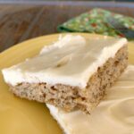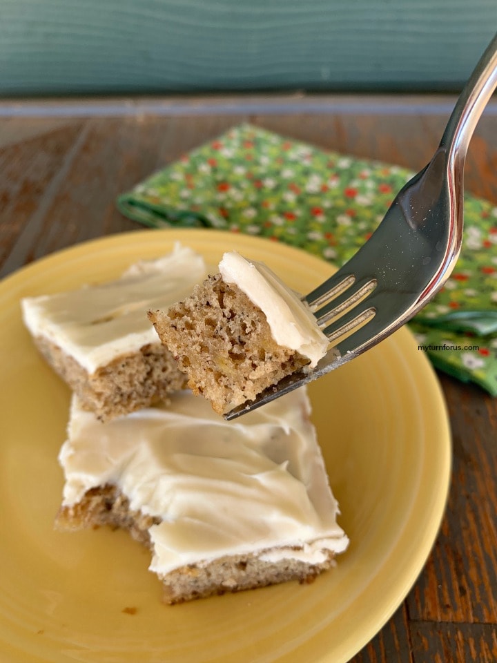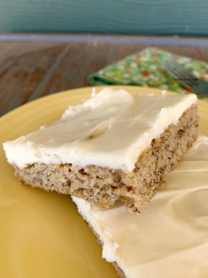 frosted banana bars, banana sheet cake frosted with cream cheese frosting