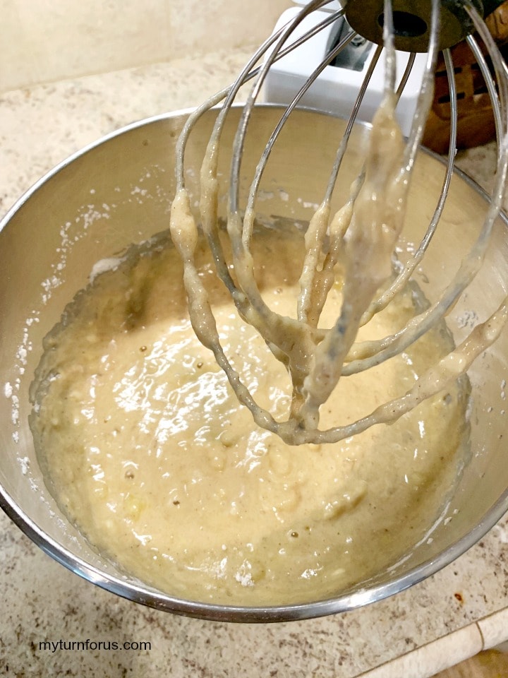 banana sheet cake recipe, mixing the ingredients for this banana sheet cake recipe