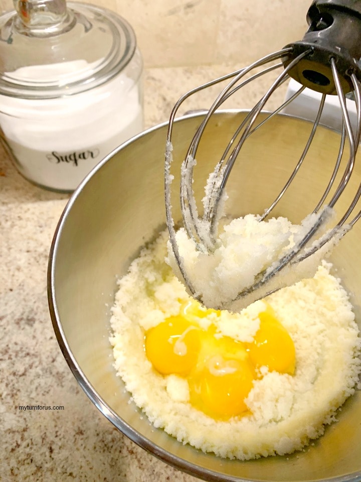 • In a large mixing bowl, (we use our aluminum mixing bowl and kitchen-aide mixer) cream the softened butter and sugar Add the eggs and beat until mixed. Add mashed bananas and vanilla and mix
