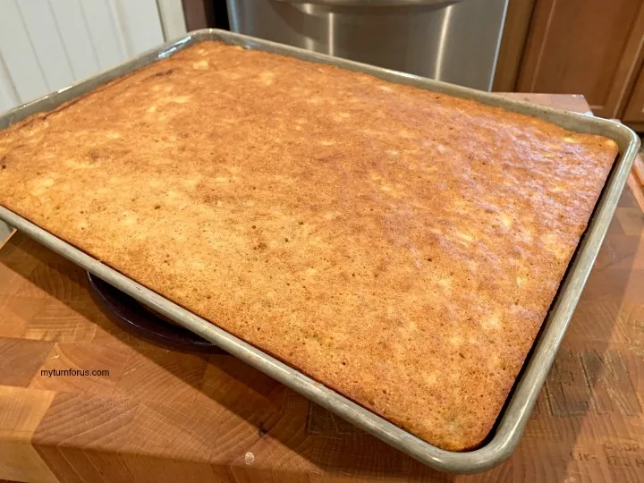 This is one of the easiest made from scratch snack recipes in our recipe box.  It’s kinda of like a banana sheet cake recipe because we use a 13 X 18 size baking pan which is considered a whole sheet pan.