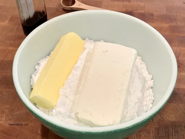 • Measure out the powdered sugar into a large mixing bowl. Add the butter and cream cheese and mix well then add the vanilla and mix. Your cream cheese frosting should be creamy and well combined.