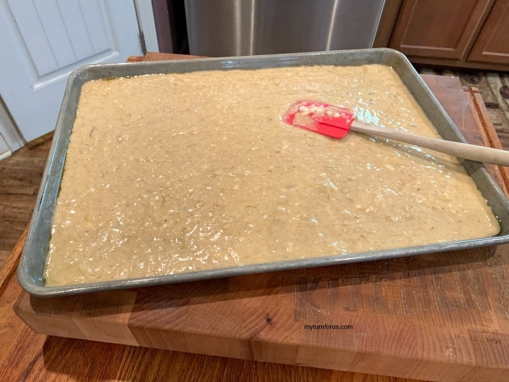 frosted banana bars, banana bars recipe batter poured into a sheet pan