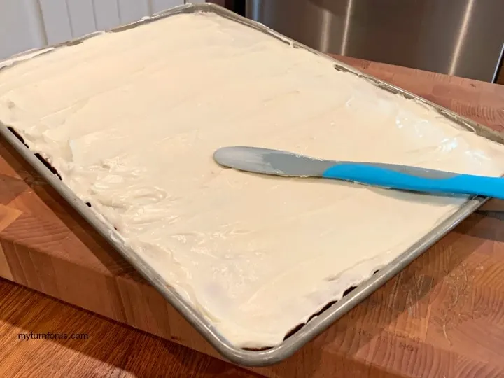 • Using a cake frosting spreader, spread over the entire banana sheet cake using the entire bowl of frosting.