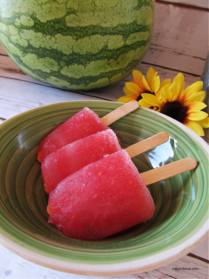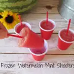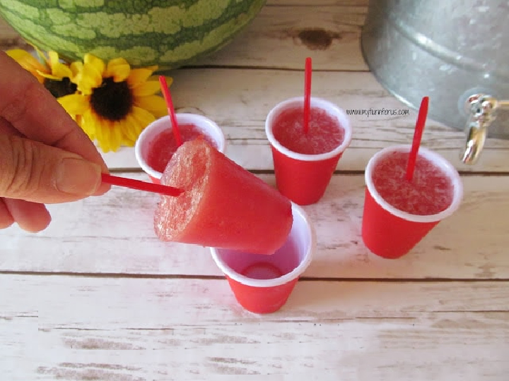 We also made these mini frozen watermelon shots using red solo plastic shot glasses and swizzle sticks which was fun. To get the stick to stay in the middle, cover each glass with foil or plastic wrap, insert a swizzle stick in the center and freeze.