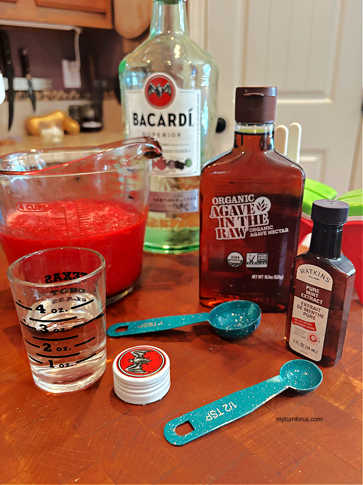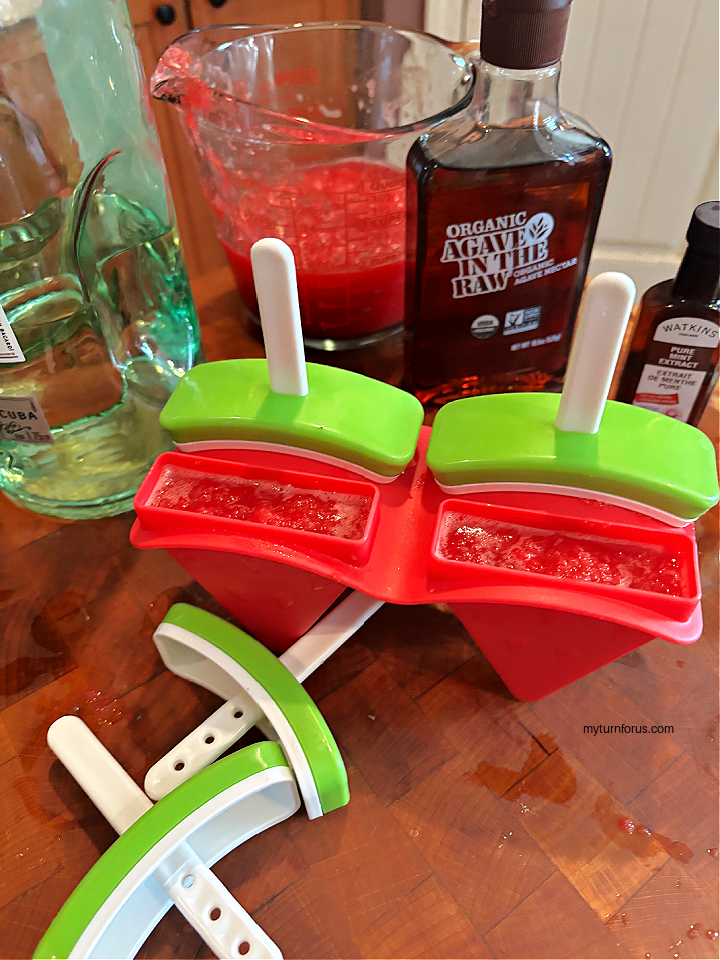 - Place the watermelon cubes into your blender and puree. Add the rum, agave, and mint extract and blend until smooth. Pour the watermelon mojito mixture into popsicle molds. Place in freezer and freeze overnight or at least 12 hours.