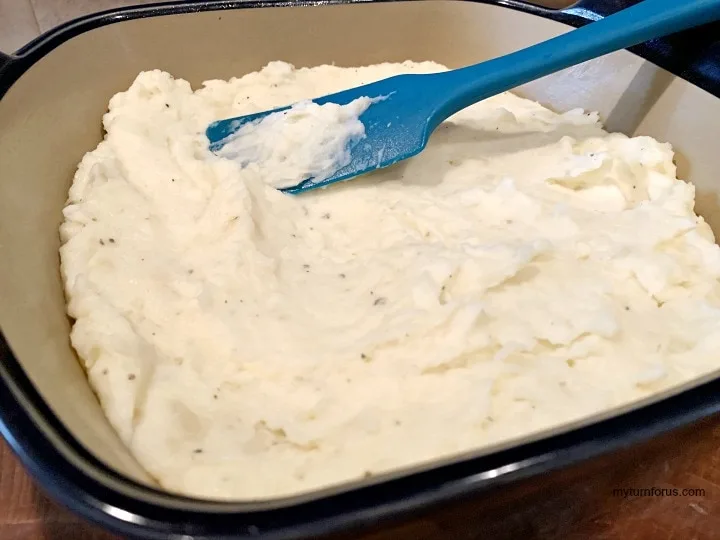 - Place the creamed potatoes mixture in a buttered casserole dish. At this time it can be cooled, covered and refrigerated for up to 8 hours but be sure to remember to remove potatoes from the fridge and bring to room temperature about an hour before baking.