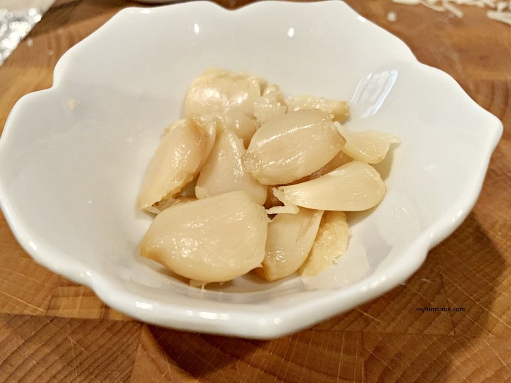 As soon as garlic is cool enough to handle, carefully remove the cooked garlic from the skins and mash in a small bowl.