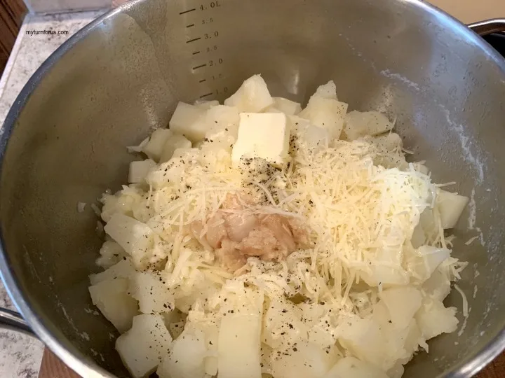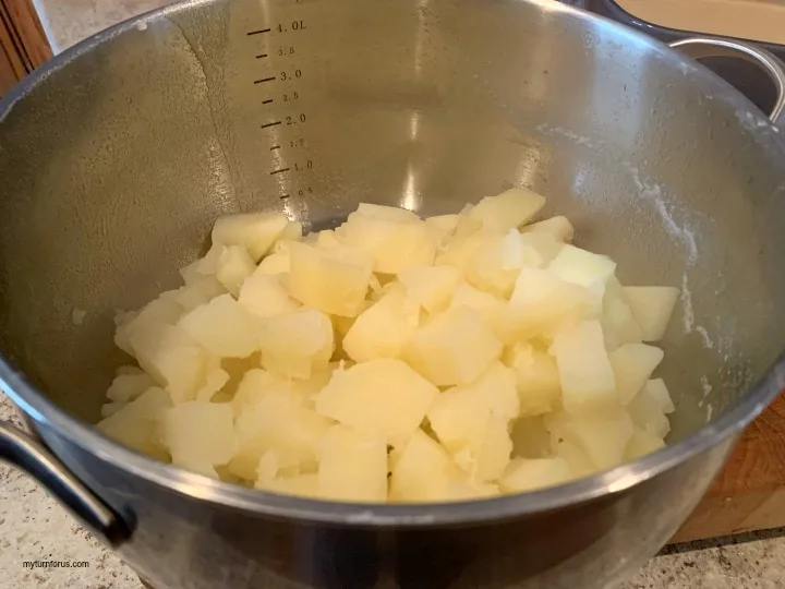 - Peel 6 medium potatoes and cube them. Place the cubed potatoes in a 2-quart pot, cover with water and boil potatoes until done.