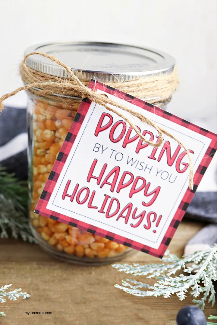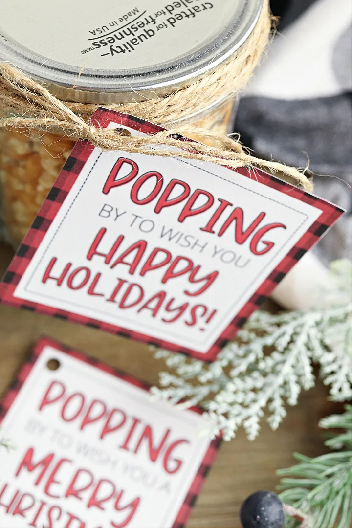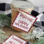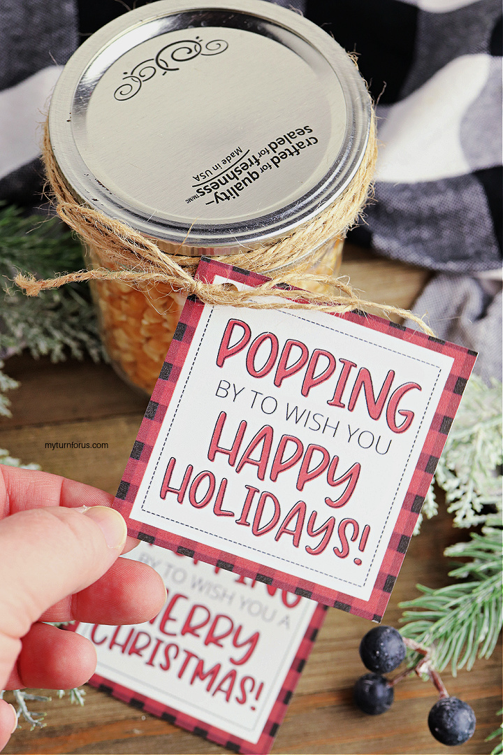 We have added two free printables so you can choose between Happy Holidays or Merry Christmas. We have so many ideas for this little gift. You could fill them with colored popcorn for a fun look or add it to a popcorn lovers gift basket.