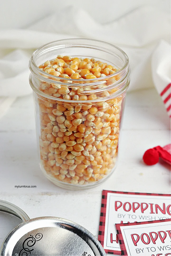 - Print the gift tags on card stock and cut out around the outer border. Fill the jar with the popcorn kernels and place the lid on top.