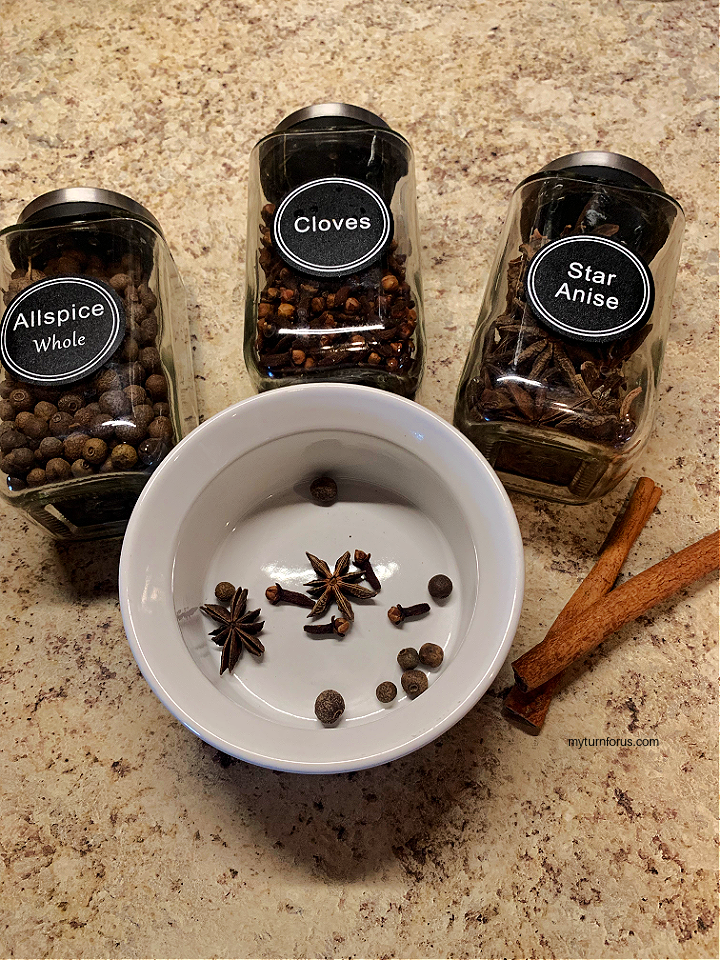 - Gather your mulling spice squad: 8 allspice berries, 4 whole cloves, 2 star anise, 2 cinnamon sticks.