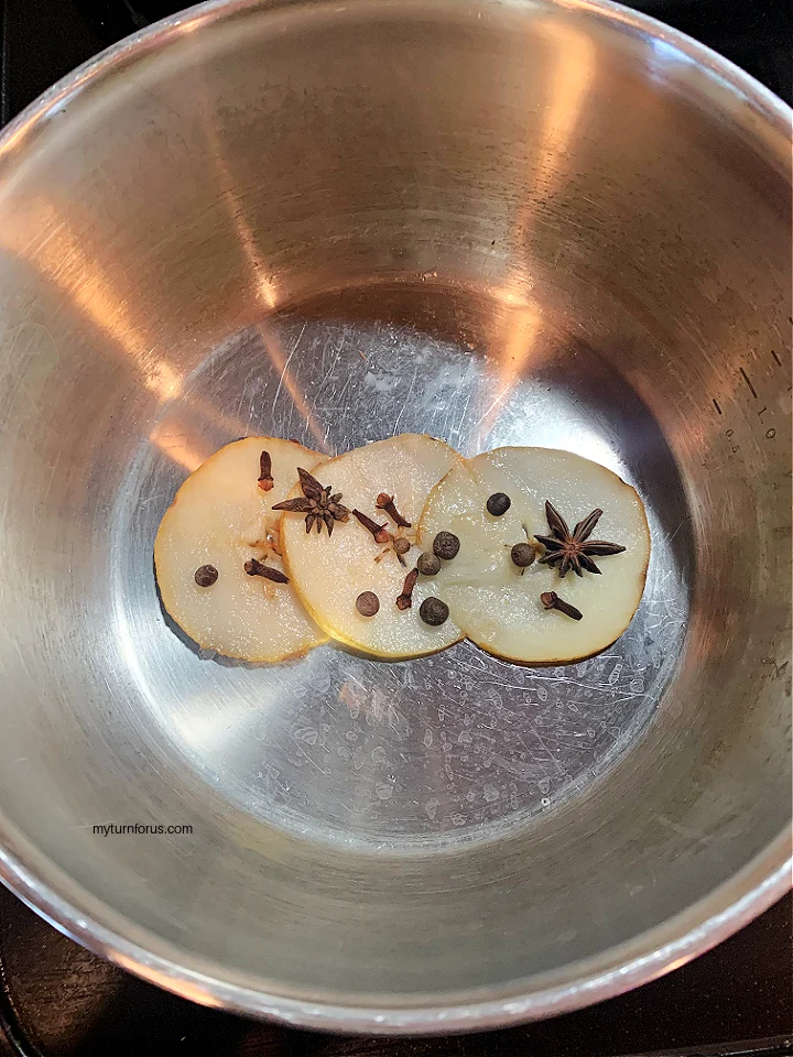 - Drop a handful of thin pear slices into a large saucepan, then add the bundle of mulling spices (allspice berries, cloves, star anise, and cinnamon sticks). The pears will quietly perfume everything with subtle sweetness while the spices work their cozy magic.