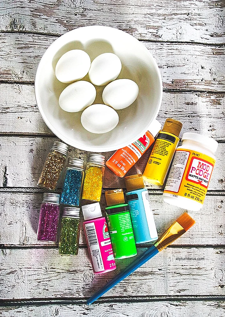 - Make sure you are starting with dry, hard boiled eggs that are cooled completely. Setup your paints with coordinating glitter colors. (ie: blue paint with blue glitter). Paint your eggs making sure the eggs are fully covered with paint.