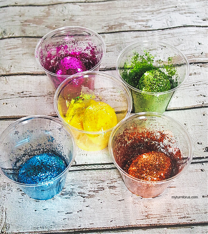 - Allow the glitter eggs to dry for an hour. Now you can use them for all your Easter activities and Decorating (if using fake eggs).