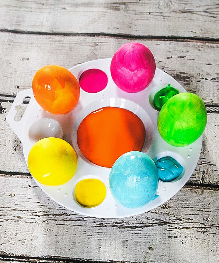 Make sure you are starting with dry, hard boiled eggs that are cooled completely. Setup your paints with coordinating glitter colors. (ie: blue paint with blue glitter). Paint your eggs making sure the eggs are fully covered with paint.