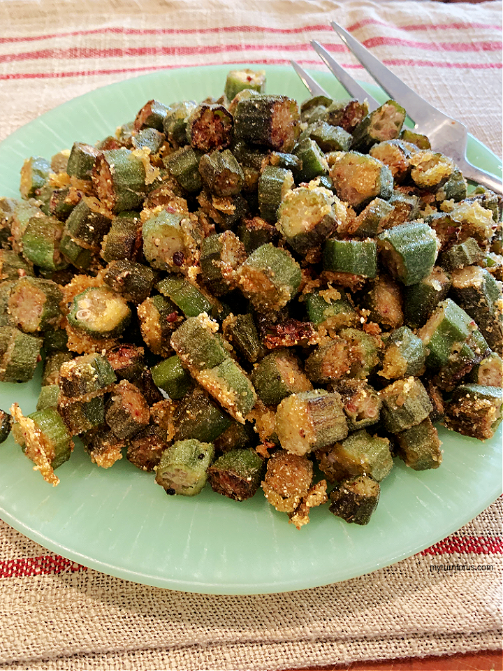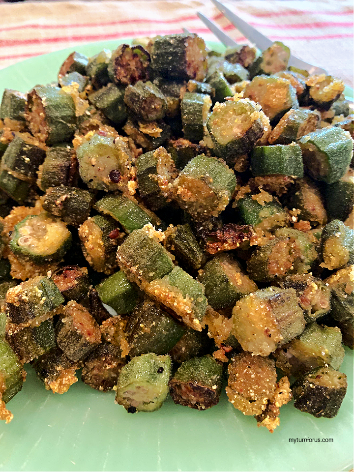 Not sure why my mom called it Texas fried okra since she was born and raised in Arkansas, maybe to tease me. But she did and we ate it like popcorn if mother allowed us anywhere near it prior to dinner. And we still love this pan fried okra with cornmeal. This simple recipe allows the taste of okra to shine without the flavor being washed out in too much breading. It does not contain flour just a simple seasoned cornmeal breading.