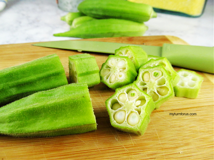 - Slice each okra pod into ½ inch slices, discarding the stem. Some also discard the tip but we usually keep them.