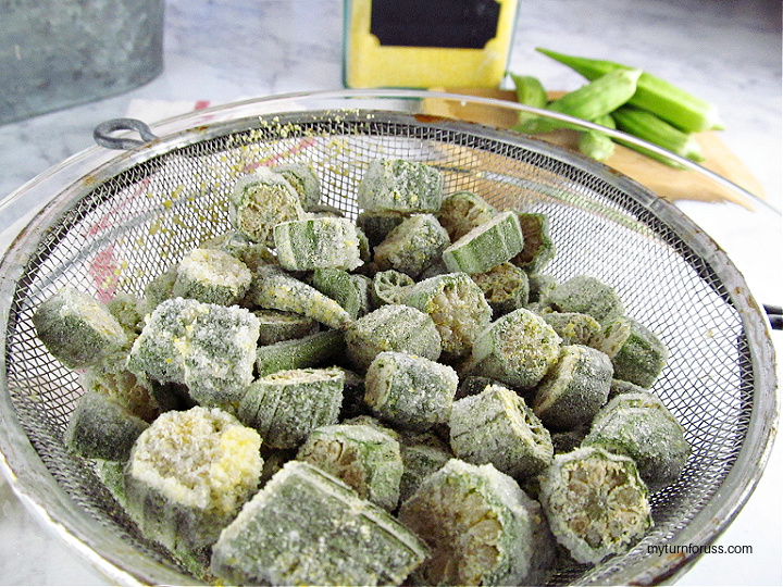 - Pour the cornmeal coated okra from the baggie into a mesh strainer over a plate. Gently shake a couple times remove excess corn meal. Or you could use a slotted spoon to remove the okra from the baggie to prevent the excess cornmeal from getting into the skillet.