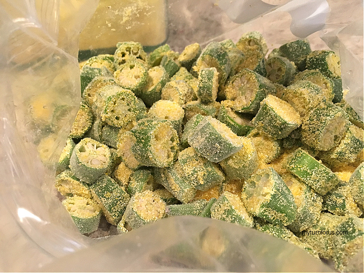 - Place the sliced okra into the ziplock baggie, add cornmeal, salt and black pepper. Seal the baggie and shake well to coat the okra with the cornmeal. There is no need to dip the okra in egg or milk since the okra produces it’s own moisture.