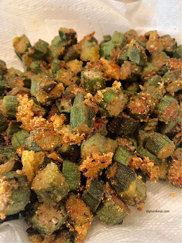 Remove the fried okra from skillet and place on a paper lined plate or paper lined pan to allow the grease to drain.