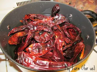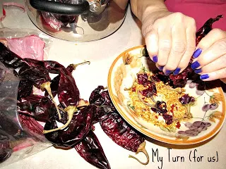 Snap off stems of red chile and shake out seeds. Wash well and place in large saucepan.
