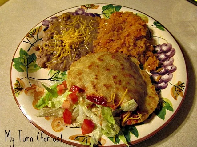 Add shredded lettuce and chopped tomato. Serve with Mexican Rice and refried beans.