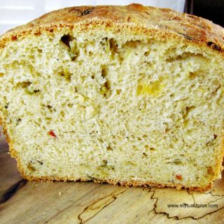 Hatch Green Chile and Cheddar Cheese baked in a loaf of homemade bread.