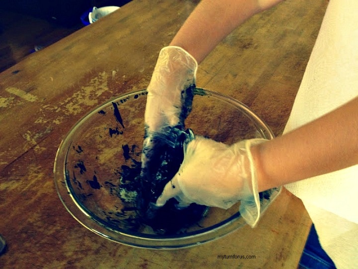 Dye a small portion of the dough black for the bats and the vampire capes. To do this, we separated a small amount of the dough into a separate glass bowl and then, using gloves (to prevent dyeing our fingers), we kneaded the color into the dough until it was all one even color. It can then be worked with the same as the other dough.