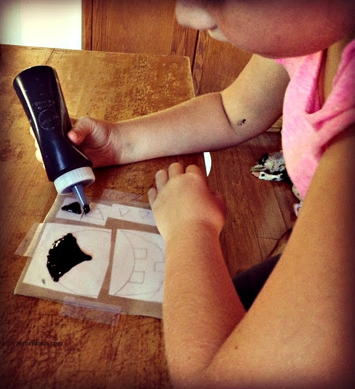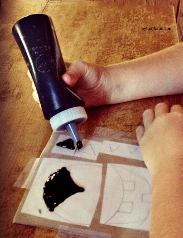 - I printed these on a small square of card stock. I then taped it to a rectangular piece of cardboard to create a “handle” on my template (A tongue depressor or popsicle stick works also). I then taped a piece of wax paper, just big enough for my design, to the countertop where I was working. I slid the template between the wax paper and the counter and then traced my design, using the desired colors with the squeeze bottles of icing.