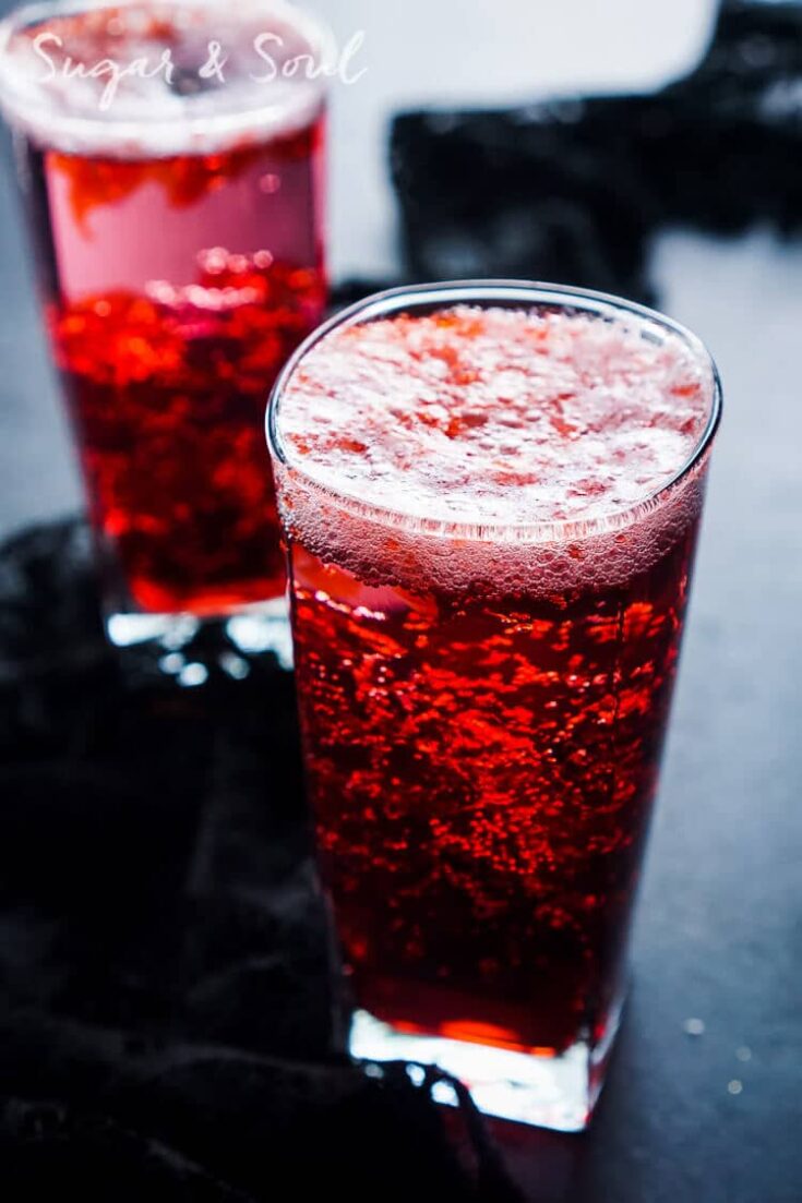 This is a hard twist on a Shirley Temple is also loaded up with grape and raspberry jello to give it that blood and guts look.