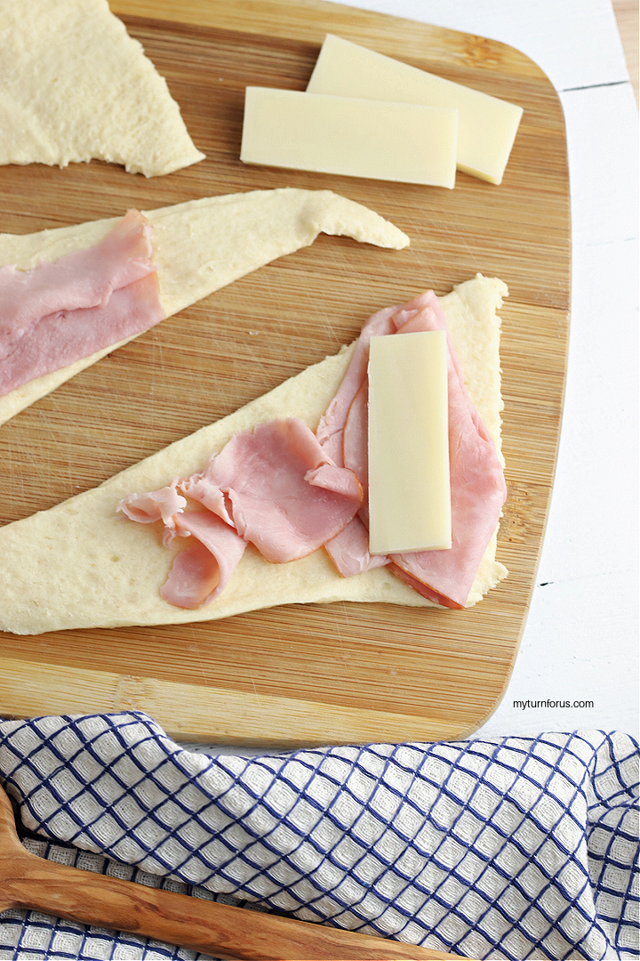 • Preheat your oven to 375 degrees F. Unroll the crescent roll dough and separate each of the eight triangles. On each triangle place two slices of ham and top with a slice of Swiss cheese.