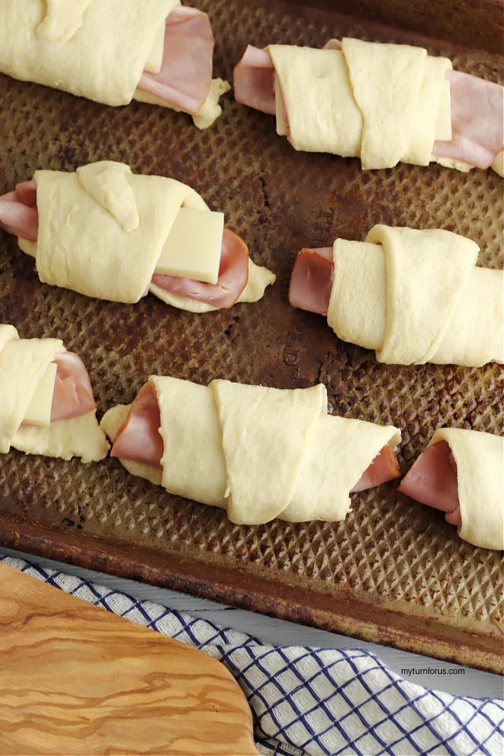 • Roll up each crescent roll around the ham and cheese and place them on your ungreased baking sheet. Place them in the preheated oven and bake for 7 minutes.