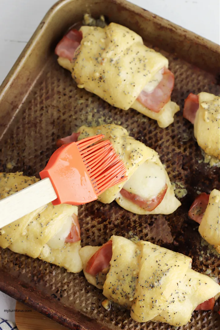 Remove the ham and cheese crescent rolls from the oven and brush them with the butter mixture.   Return them to the oven and bake for an additional 7 to 9 minutes, until rolls are golden brown.