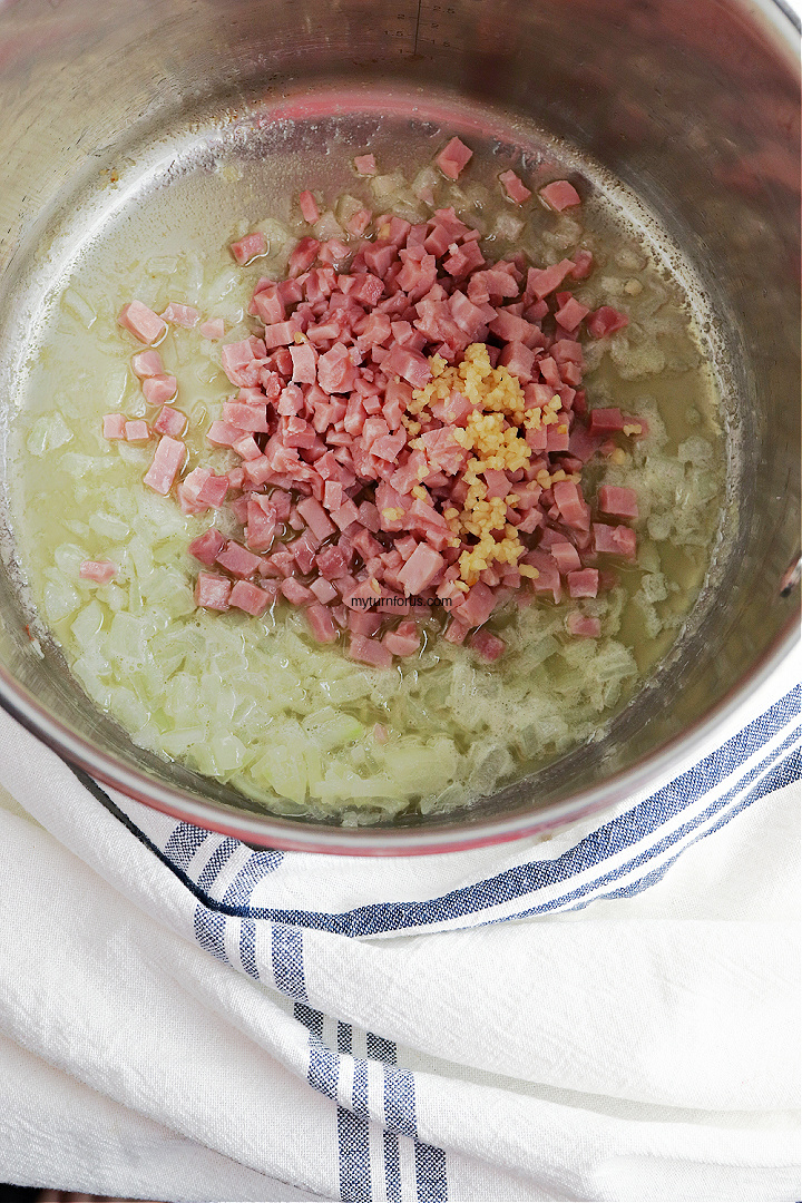 Add your chopped ham and minced garlic to the onion butter mixture and cook an additional one to two minutes.